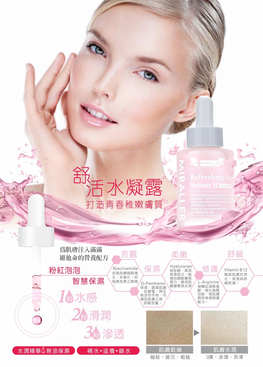 粉紅泡泡水凝露質地,智慧保濕機制,含高濃度維他命及玻尿酸不含油脂的水感凝露,接觸肌膚1秒,立即化成超水感的液狀精華質地,柔滑舒適,複合保濕成分能有效使肌膚豐潤細滑,解決肌膚保濕與修護的需求!並給予肌膚零負擔、不黏膩的觸感!