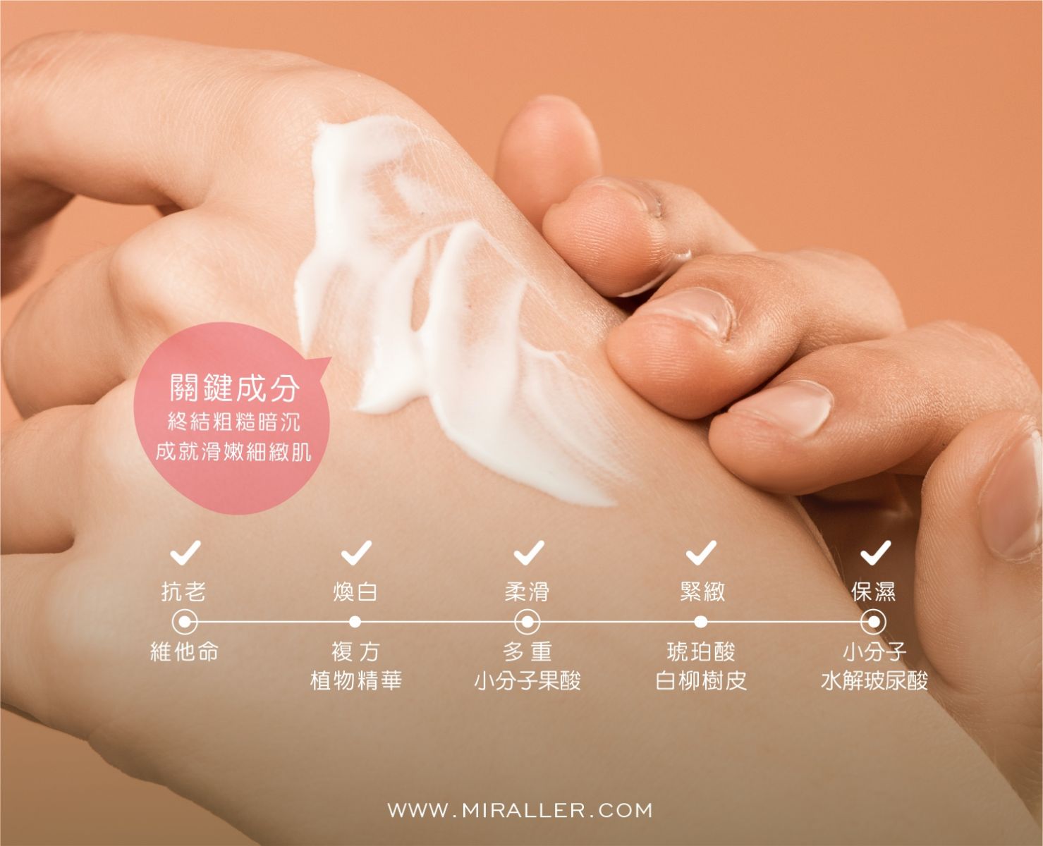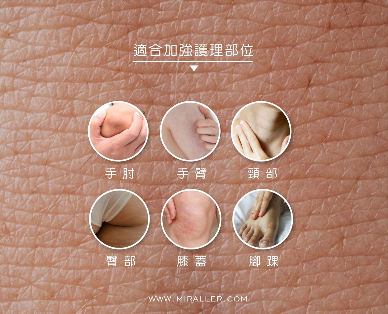 也可局部塗抹於需要加強護理的肌膚部位,如 : 手肘、膝蓋、臀部、手臂、小腿、腳踝、色素不均處或較粗糙肌膚部位....。